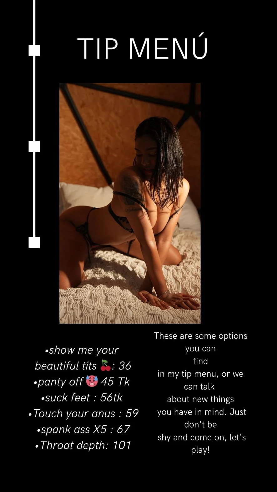 Dança erótica, Tapas, Capô de fusca, Dildo ou vibrador, Striptease, Fetiche por pés, Gozada na cara, Brinquedos sexuais, Salto alto, Rebolando, De quatro, Ahegao, Penetração com dedos, Garganta profunda, Boquete, Masturbação, Peitinhos, Orgasmo, Show com óleo, Ejaculação feminina, Hardcore